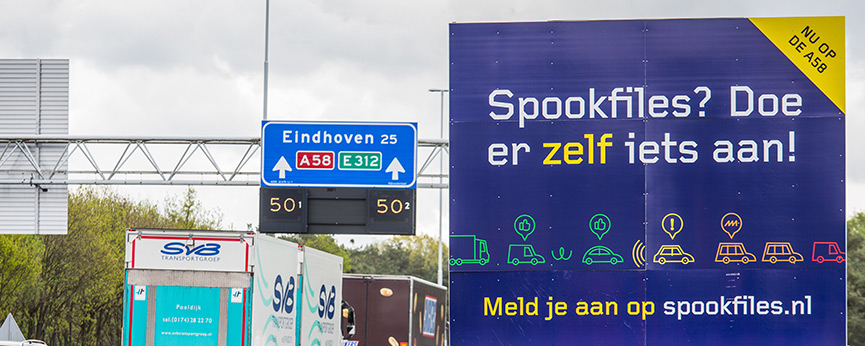 Weggebruikers op de A58 tussen Tilburg en Eindhoven kunnen sinds deze week een nieuwe en snellere data-infrastructuur testen voor de zogenaamde Spookfiledienst. Op het traject Tilburg – Eindhoven zorgen 34 wifi-kastjes langs de weg ervoor dat de spookfile-apps ZOOF en Flowpatrol real-time informatie kunnen geven over de verkeerssituatie.