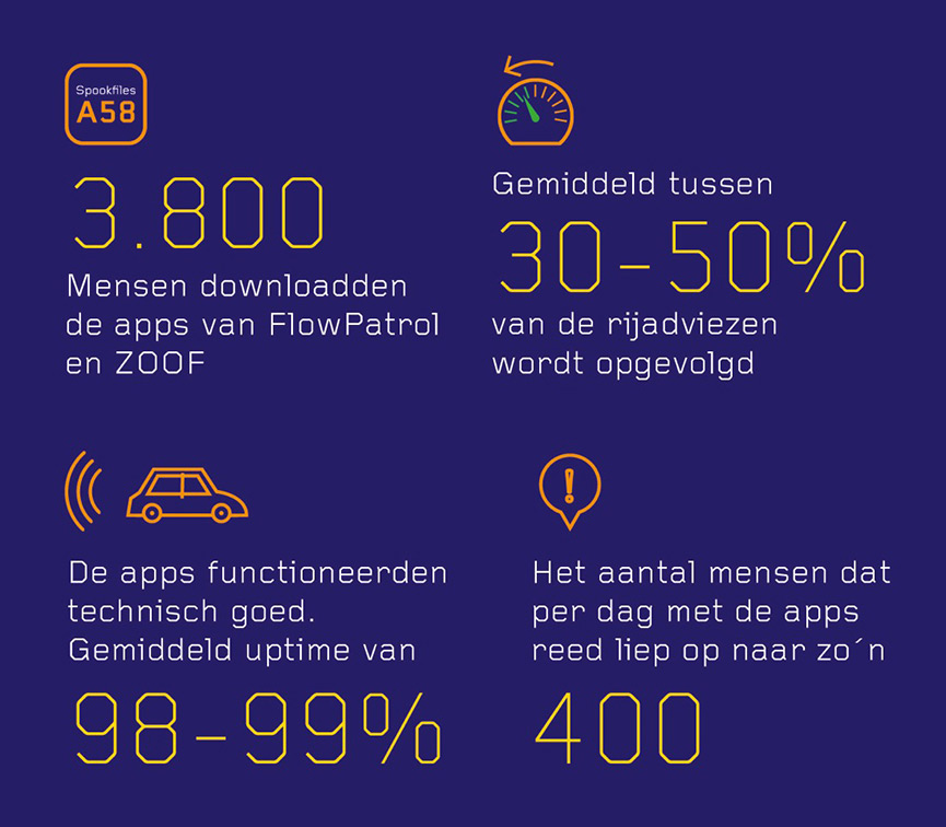 De apps FlowPatrol, SmartCAR en ZOOF zijn gereed. Ze werken op de achterliggende Talking Traffic-infrastructuur. Via een 3g/4g-netwerk ontvangen ze data over de verkeerssituatie enkele kilometers verderop. Dit verwerken ze tot snelheidsadvies voor de weggebruiker. Zo’n 50 weggebruikers pre-testen deze eerste spookfilediensten in het verkeer op de A58. Lees meer: